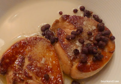 Este prato chega na mesa somente com os dois escalopes de foie gras. O garçon vem gentilmente comunicar que vai finalizar na mesa, com sal e pimenta.