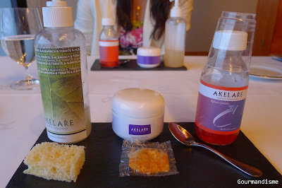 O gel é de tomate e abacate. A esponja é um biscoito de cebola, para comer junto com o gel. O saquinho de sais de banho, que vai diretamente à boca, é feito de gelatina transparente com recheio de farofa de camarão.
