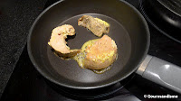 Aqueça bem outra frigideira e doure os foie gras de ambos os lados. (não adicione qualquer gordura à cocção, a gordura presente neles é mais do que suficiente)