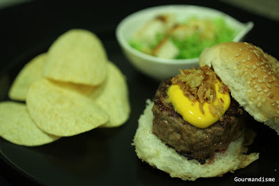 Nesta receita de Cheeseburguer com Ceasar Salad, o mini-hamburguer está na parte inferior do prato, salada no lado superior direito e batatas no lado superior esquerdo.