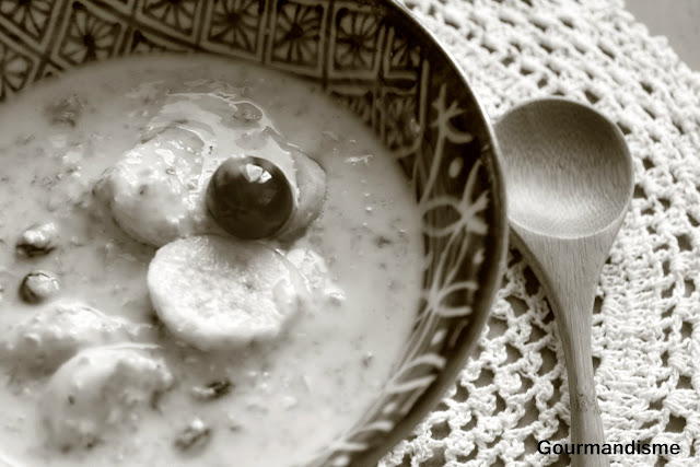 Misture todos os ingredientes e decore com algumas amêndoas e bananas.