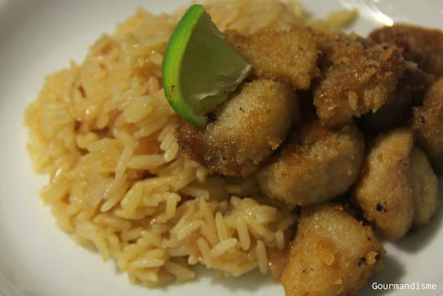 Sirva com o arroz no centro do prato e os cubos de peixe por cima.