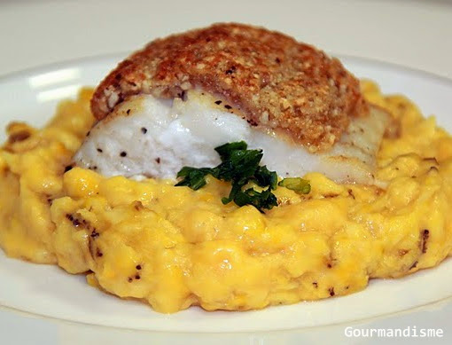 Em um prato, coloque no centro o purê de banana-da-terra e por cima a posta de abadejo com a crosta.