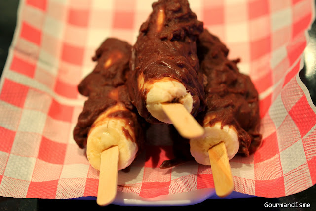 Espete as bananas com os palitinhos e mergulhe no chocolate.