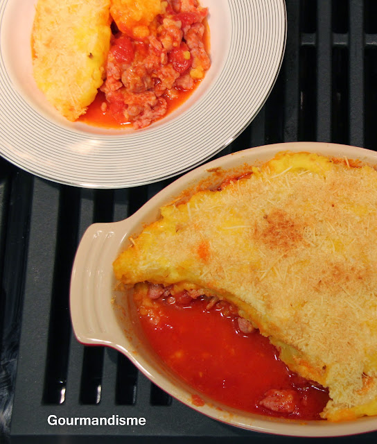 Monte o prato com a linguiça primeiro, seguida do purê de mandioquinha. Cubra com o queijo.